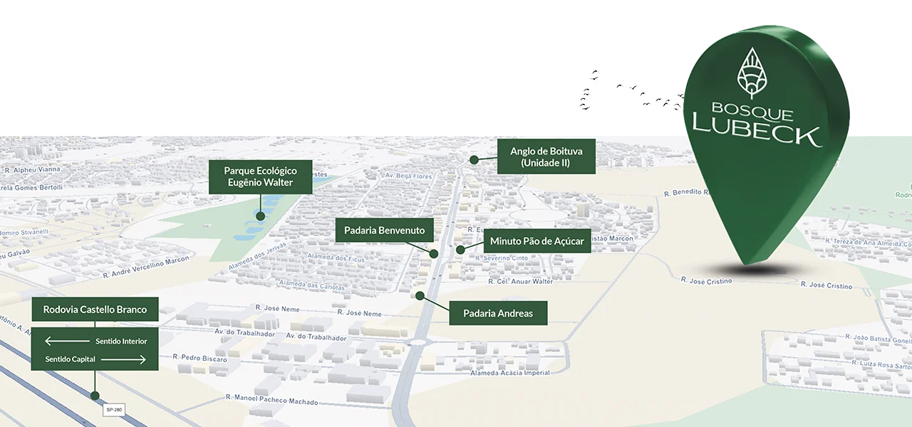 Localizado em uma das áreas mais privilegiadas de Boituva, próximo à Avenida Zélia de Lima Rosa, o Bosque de Lubeck garante fácil acesso e valorização. A apenas 1h10 de São Paulo, o empreendimento une a tranquilidade do interior com a praticidade de estar perto da capital, em uma região em constante crescimento e com infraestrutura completa.